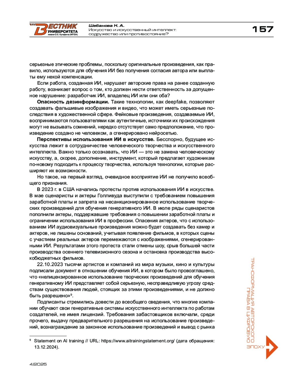 4. Kristofer Erickson. Copyright protection in AI-generated works, 31 January 2024 // URL: https://pec.ac.uk/blog_entries/copyright-protection-in-ai-generated-works (дата обращения: 11.12.2024).