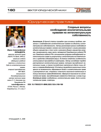 В данной статье приведен срез основных проблем, связанных с сообладанием исключительным правом на объекты интеллектуальной собственности. Автор рассмотрел режим сообладания исключительным правом и вопрос его соотношения с иными режимами общего имущества, в том числе с режимом общего имущества супругов, применимость норм части четвертой Гражданского кодекса РФ или Семейного кодекса РФ к отношениям супругов-сообладателей исключительного права на результаты интеллектуальной деятельности и средства индивидуализации. В статье отмечены особенности использования произведения соавторами. Автор исследовал порядок распоряжения исключительным правом, которое принадлежит нескольким лицам, а также последствия заключения сделок лишь одним из соправообладателей. В статье приводятся различные точки зрения на возможность образования долей в исключительном праве и распоряжения ими, отражены сложности взыскания компенсации в пользу нескольких правообладателей, обращения взыскания на исключительное право, принадлежащее совместно должнику и иному лицу.