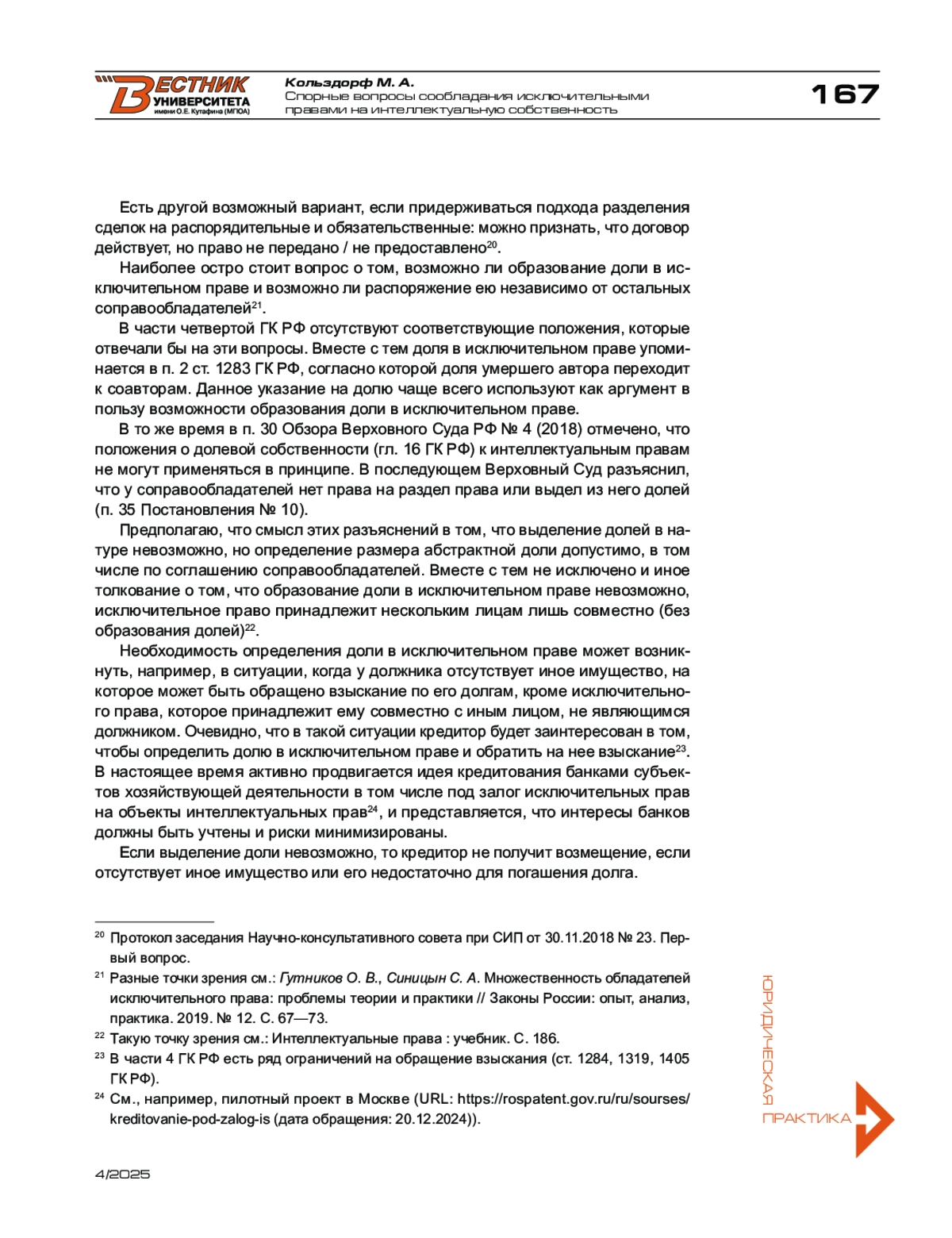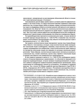 1. Гутников О. В., Синицын С. А. Множественность обладателей исключительного права: проблемы теории и практики // Законы России: опыт, анализ, практика. - 2019. - № 12. - С. 67-73.