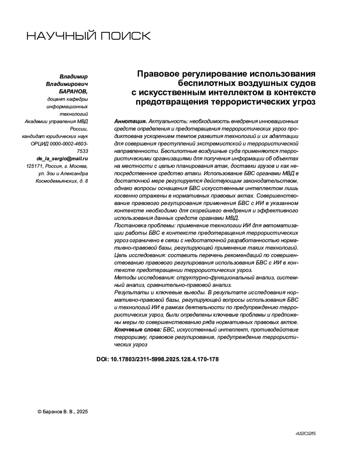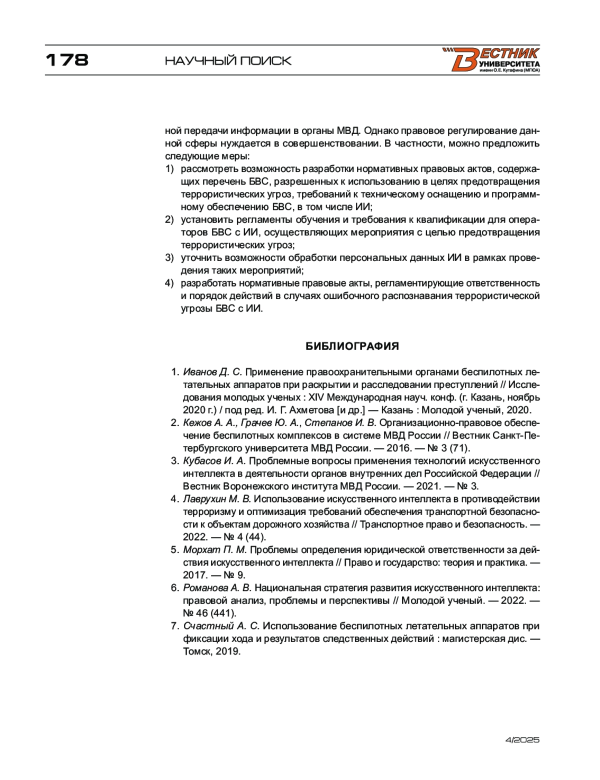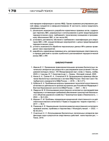 Результаты и ключевые выводы. В результате исследования нормативно-правовой базы, регулирующей вопросы использования БВС и технологий ИИ в рамках деятельности по предупреждению террористических угроз, были определены ключевые проблемы и предложены меры по совершенствованию ряда нормативных правовых актов.