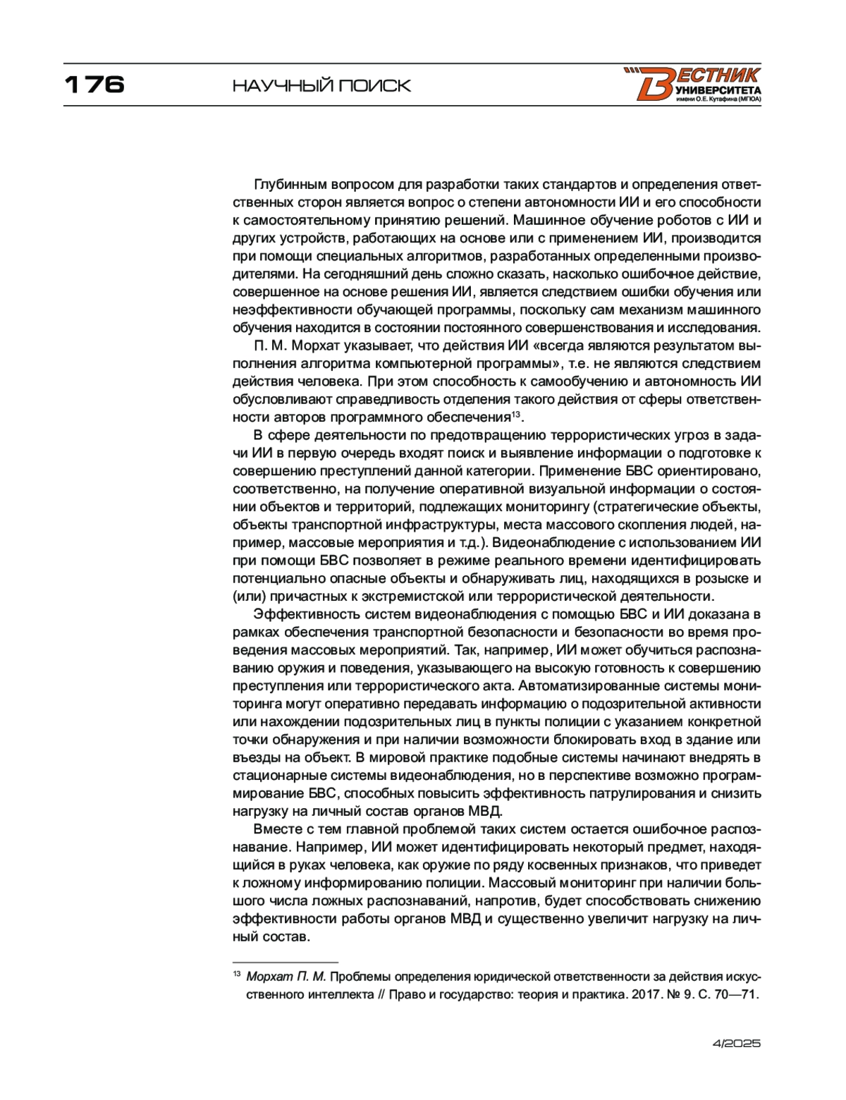 5. Морхат П. М. Проблемы определения юридической ответственности за действия искусственного интеллекта // Право и государство: теория и практика. - 2017. - № 9.