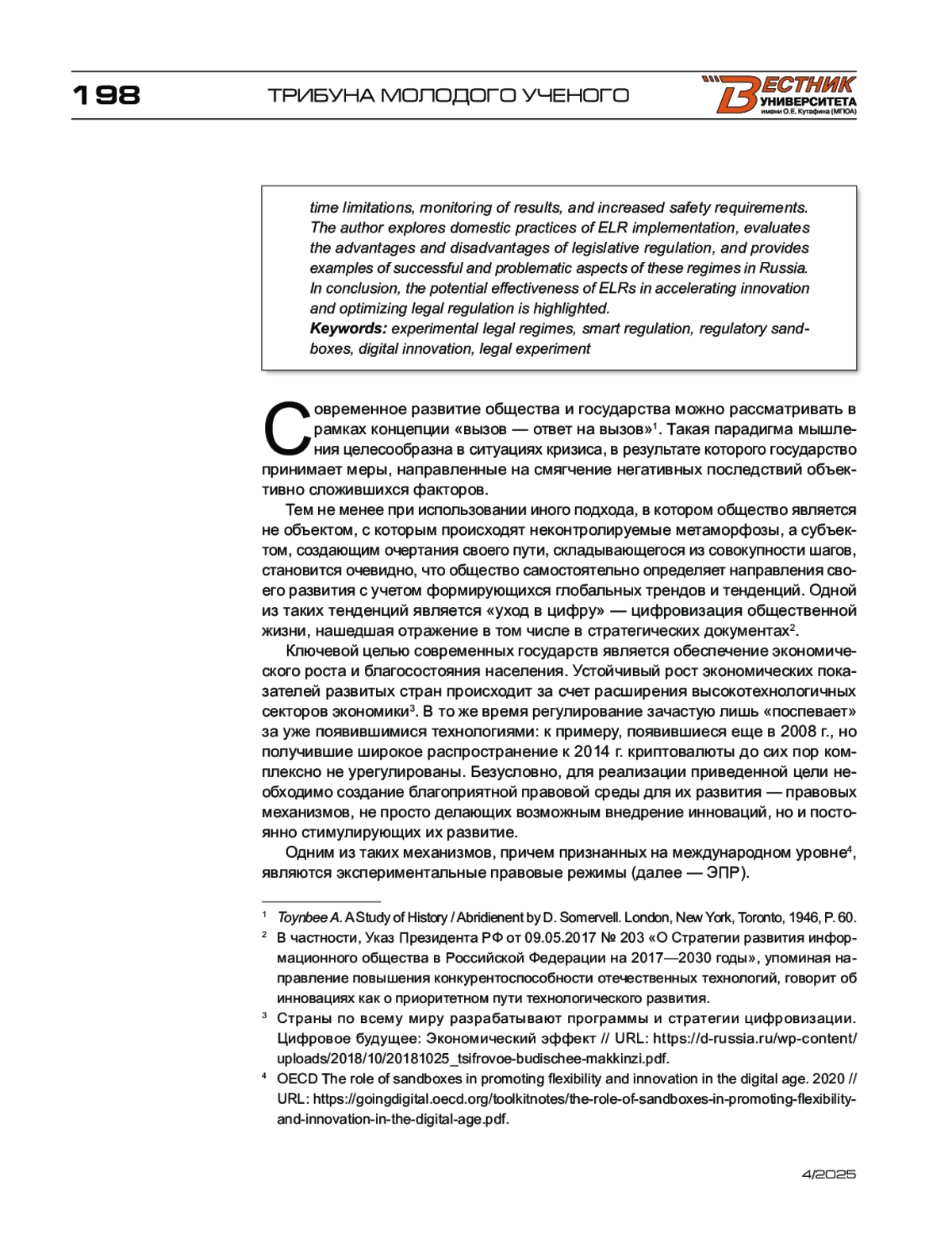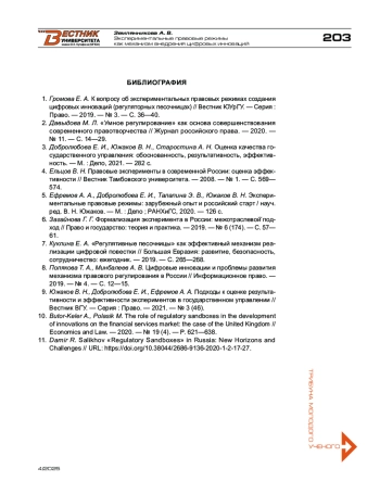 1. Громова Е. А. К вопросу об экспериментальных правовых режимах создания цифровых инноваций (регуляторных песочницах) // Вестник ЮУрГУ. - Серия: Право. - 2019. - № 3. - С. 36-40.