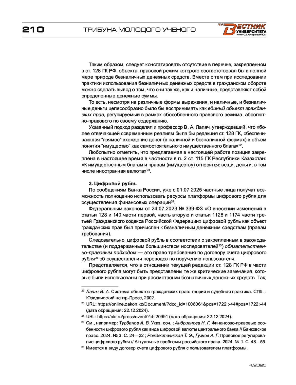4. Габов А. В. Цифровой рубль Центрального банка как объект гражданских прав // Актуальные проблемы российского права. - 2021. - № 4. - С. 55-65.