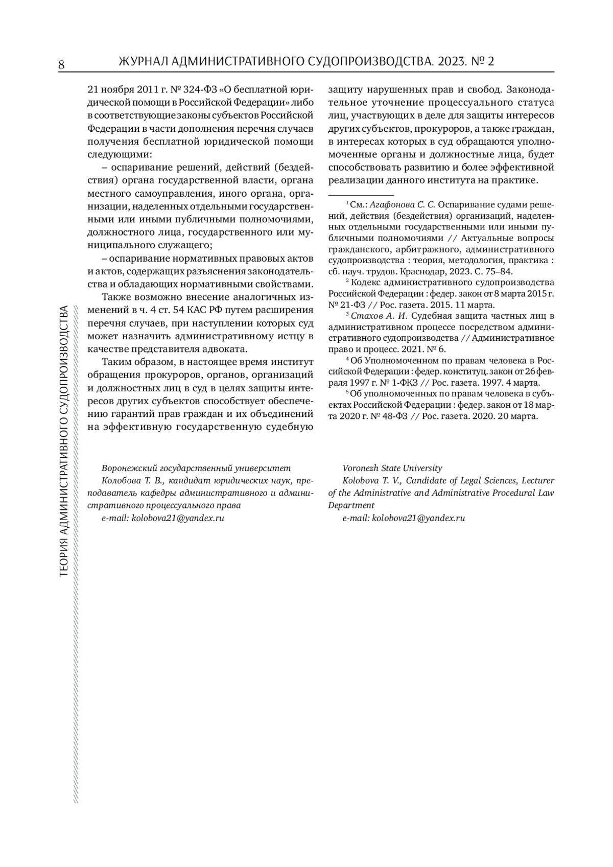 КОЛОБОВА Т. В. ЗАЩИТА НАРУШЕННЫХ ИЛИ ОСПАРИВАЕМЫХ ПРАВ, СВОБОД И ЗАКОННЫХ ИНТЕРЕСОВ ГРАЖДАН И ОРГАНИЗАЦИЙ ОРГАНАМИ ПУБЛИЧНОЙ ВЛАСТИ И ДОЛЖНОСТНЫМИ ЛИЦАМИ // ЖУРНАЛ АДМИНИСТРАТИВНОГО СУДОПРОИЗВОДСТВА. 2023. № 2