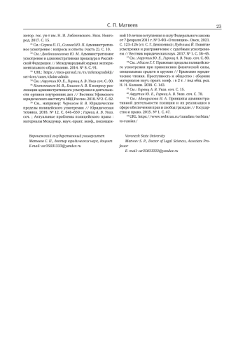 37. Абасов Г. Г. Правовые пределы полицейского усмотрения при применении физической силы, специальных средств и оружия // Крымские юридические чтения. Преступность и общество: сборник материалов науч.-практ. конф.: в 2 т. / под общ. ред. Н. Н. Колюки. 2018. С. 143. EDN: YPIUHR