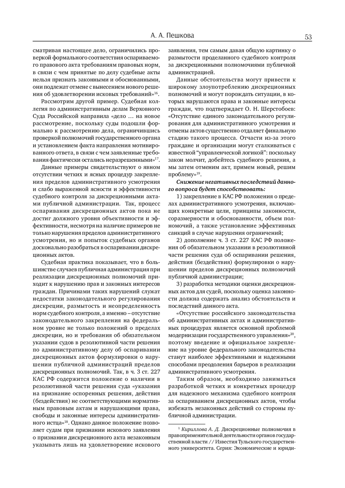 В статье анализируются проблемные вопросы, связанные с оспариванием дискреционного акта в административном судопроизводстве, затронуты проблемы определения пределов административного усмотрения. Понимание этих пределов имеет важное значение для обеспечения правовой защиты граждан и поддержания справедливости в административных процедурах. Исследование данной темы позволило установить условия, определяющие границы дискреционных полномочий, а также проведение анализа законодательства и судебной практики по регулированию процедуры судебного оспаривания дискреционных актов. В результате предложены пути совершенствования, направленные на установление четких критериев определения пределов административного усмотрения и улучшение процедуры судебного оспаривания дискреционных актов, а также внесено предложение о закреплении в законодательстве на федеральном уровне положения, касаемого установления пределов административного усмотрения и формулировки в резолютивной части суда об оспаривании дискреционного акта для эффективного и надежного преодоления барьеров с реализацией осуществления публичной администрацией дискреционных полномочий.