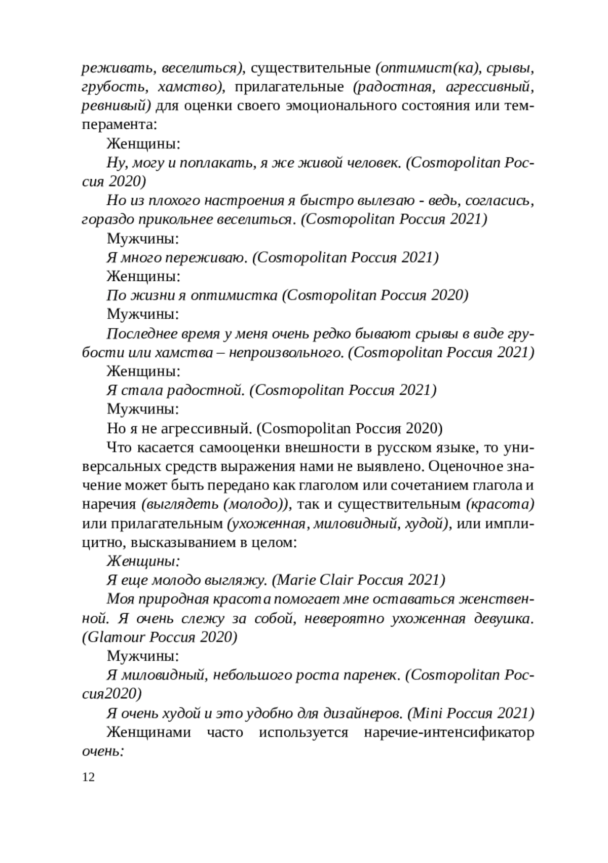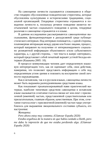 Данная статья посвящена анализу самооценочных высказываний с точки зрения языковых средств выражения самооценки в дискурсивных условиях интервью. Самооценка рассматривается в рамках категории оценки как ее частный случай, отличительной чертой которого является совпадение субъекта и объекта оценки. Исследование проводится в сопоставительном ключе на материале испанского и русского языков. Самооценочные высказывания анализируются с позиций гендерного подхода. Рассматриваются специфика выражения человеком оценки своей деятельности, личностных качеств, внешности, эмоционального состояния и темперамента. В процессе анализа практического материала выделяются наиболее характерные средства выражения самооценки личности. Подчеркивается специфика использования тех или иных единиц языка в зависимости от гендерной принадлежности личности. В конце статьи делаются выводы обобщающего характера по результатам проведенного анализа. This article is devoted to the linguistic means of expressing selfassessment when analyzing self-assessment statements in interviews. Selfassessment is studied as a particular category of assessment in which the subject and object of assessment are the same. Self-assessment statements in Spanish and Russian languages are analyzed to find out gender differences in expressing male and female assessment of their activities, personal qualities, appearance, emotional state and temperament. The most typical characteristic features of self-assessment are singled out and different language means of expressing self-assessment are identified. It is claimed that the language units used to characterize self-assessment by men and women depend on the gender of the individuals. At the end of the article, general conclusions are made to prove the results of the analysis.