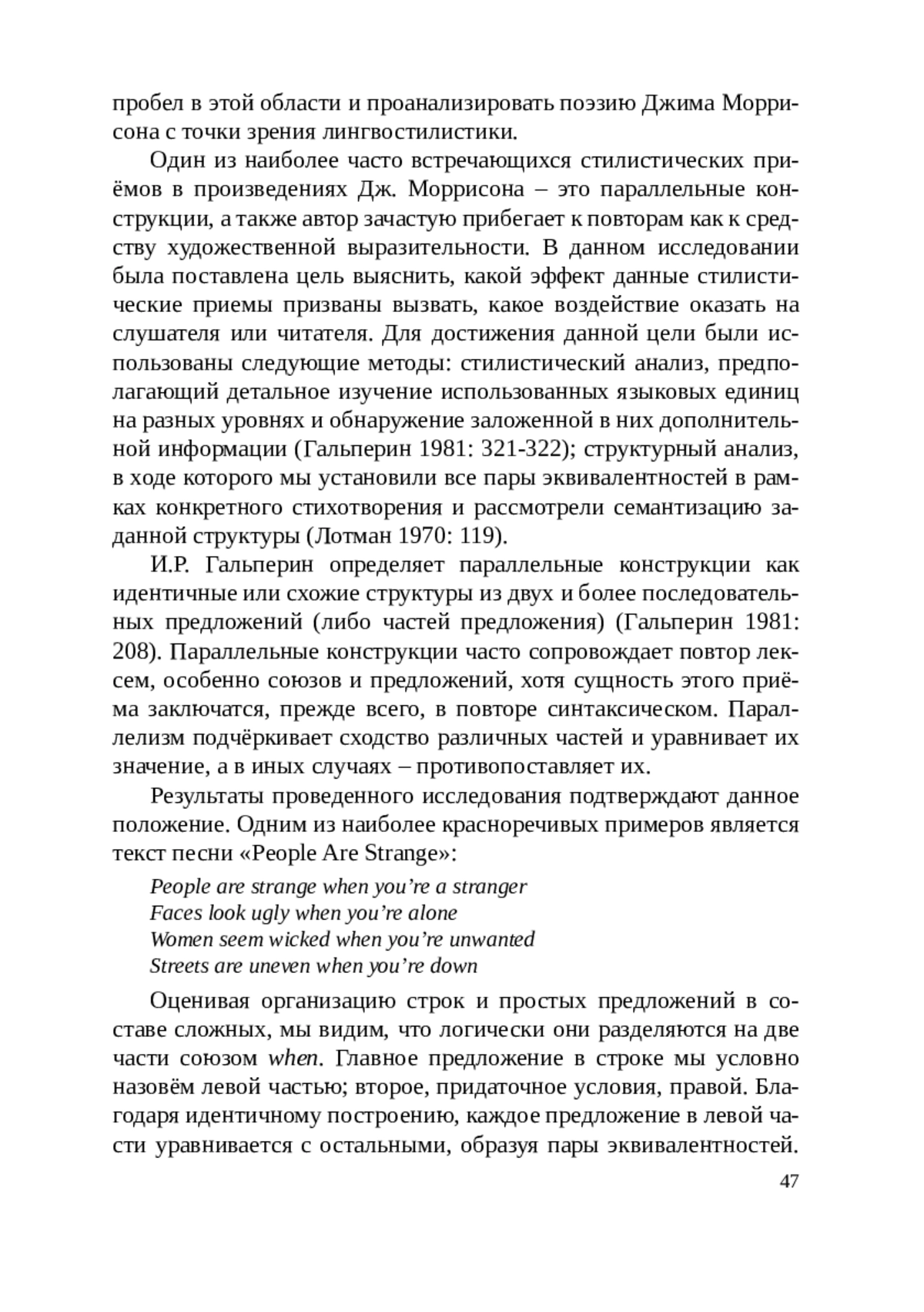 Авторы статьи исследуют особенности использования повторов и параллельных конструкций в поэзии Дж. Моррисона с целью выяснить, какую задачу решал поэт, прибегая к указанным стилистическим приемам. Изучив ряд контекстов, авторы заключают, что средства синтаксиса позволяют Моррисону сделать свой текст более содержательным и выразительным, а также обеспечить дополнительную семантическую нагрузку текста.