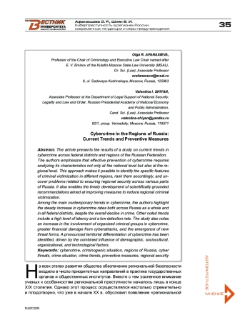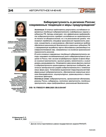 В статье представлены результаты исследования современных тенденций киберпреступности в федеральных округах и субъектах РФ. Авторы отмечают, что эффективное предупреждение киберпреступности требует исследования ее характеристик не только на общероссийском, но и на региональном уровне, что позволит определить специфику криминальной пораженности регионов, осуществить их ранжирование, обусловит выявление проблем обеспечения региональной безопасности в различных субъектах РФ и своевременную выработку научно обоснованных рекомендаций по совершенствованию мер, направленных на снижение криминальной пораженности регионов.