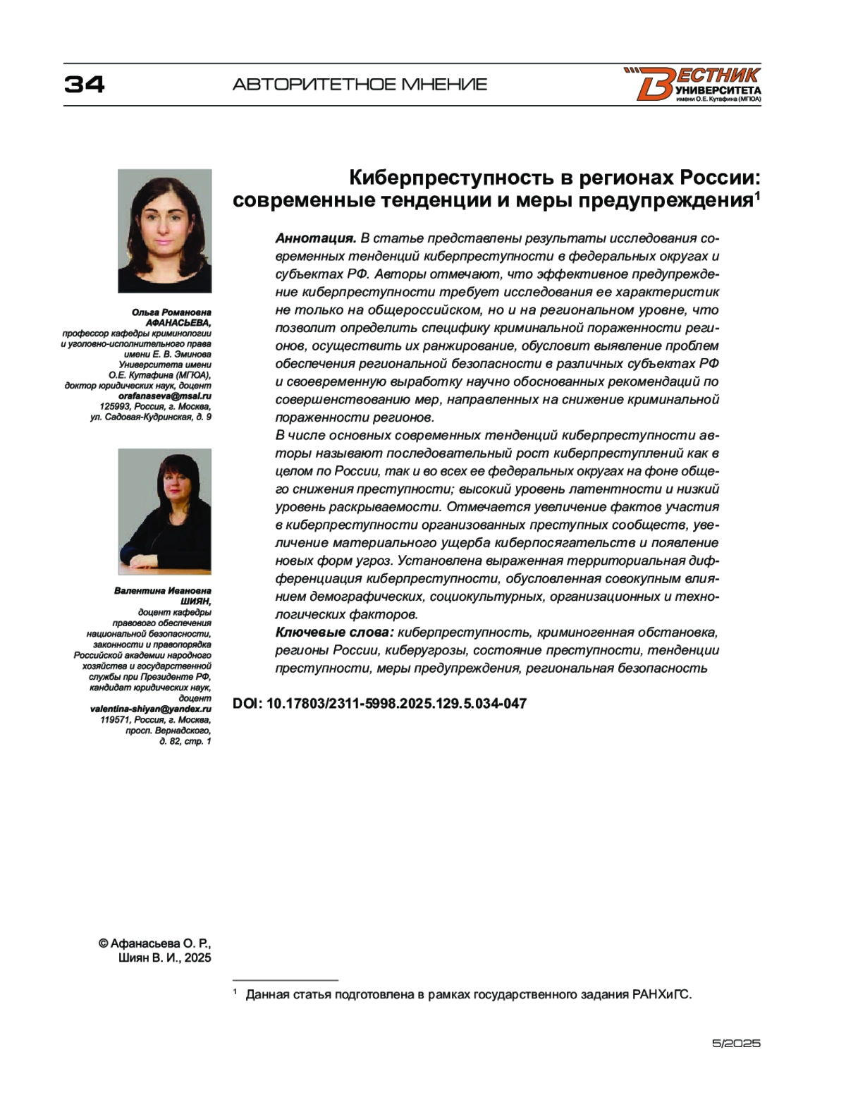 В числе основных современных тенденций киберпреступности авторы называют последовательный рост киберпреступлений как в целом по России, так и во всех ее федеральных округах на фоне общего снижения преступности; высокий уровень латентности и низкий уровень раскрываемости. Отмечается увеличение фактов участия в киберпреступности организованных преступных сообществ, увеличение материального ущерба киберпосягательств и появление новых форм угроз. Установлена выраженная территориальная дифференциация киберпреступности, обусловленная совокупным влиянием демографических, социокультурных, организационных и технологических факторов.