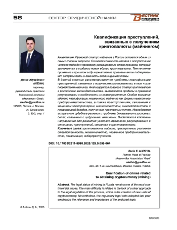 В данной статье рассматриваются проблемы квалификации преступлений, связанных с получением криптовалюты, в том числе посредством майнинга. Анализируется правовой статус криптовалют в российском законодательстве, выявляются пробелы в правовом регулировании и особенности их правоприменения. Особое внимание уделено квалификации незаконного майнинга как формы незаконного предпринимательства, а также преступлениям, связанным с хищением электроэнергии, мошенничеством, вымогательством и легализацией доходов, полученных преступным путем. Исследуются актуальные судебные решения и проблемы доказывания в уголовных делах, связанных с цифровыми активами. Выделяются ключевые направления для развития уголовно-правового регулирования в отношении преступлений, связанных с криптовалютами.