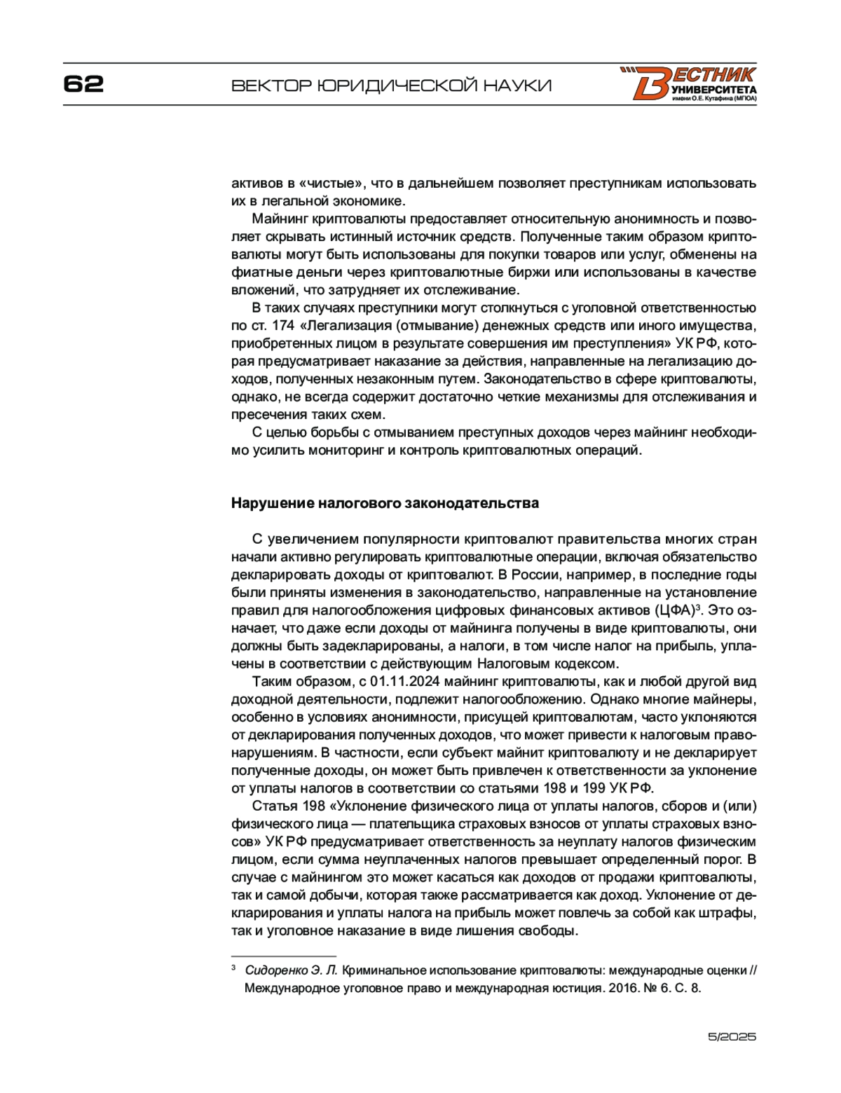 4. Сидоренко Э. Л. Криминальное использование криптовалюты: международные оценки // Международное уголовное право и международная юстиция. - 2016. - № 6.
