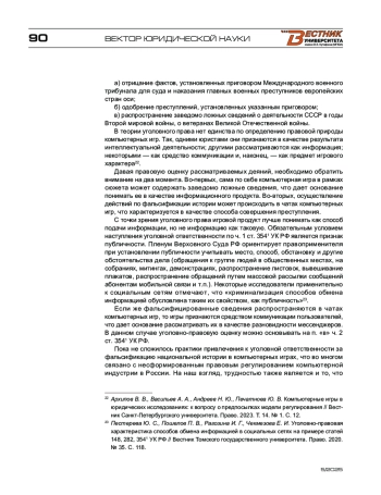 Статья посвящена уголовно-правовой оценке фальсификации истории в компьютерных играх, которые сегодня наряду с социальными сетями, интернет-порталами, видеохостингами, новостными сайтами стали дополнительной коммуникационной площадкой для обмена данными среди пользователей информационных технологий. Согласно исследованиям международных компаний, количество игроков постоянно увеличивается, охватывая разные возрастные группы и регионы, что подтверждает массовый характер игровой индустрии. Особо распространены среди молодого поколения компьютерные игры, сюжет которых связан с событиями Второй мировой войны и Великой Отечественной войны. В этой связи в статье сформулированы предложения по квалификации действий, фальсифицирующих исторические факты, содержащиеся в компьютерных играх. Обращается внимание на неопределенность правовой природы компьютерных игр, отсутствие регламентации разработки и определения содержания игровых продуктов, что порождает сложности уголовно-правовой оценки искажения информации об исторических событиях в играх.