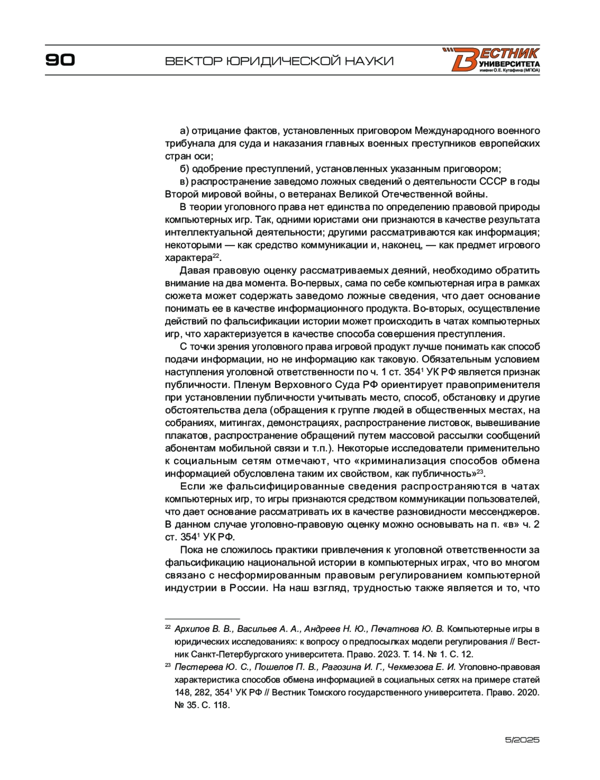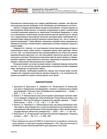 1. Архипов В. В., Васильев А. А., Андреев Н. Ю., Печатнова Ю. В. Компьютерные игры в юридических исследованиях: к вопросу о предпосылках модели регулирования // Вестник Санкт-Петербургского университета. - Право. - 2023. - Т. 14. - № 1. - С. 5-21.