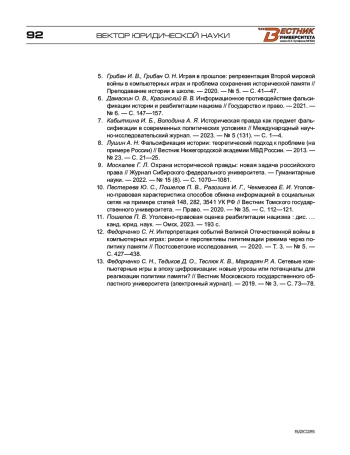 12. Федорченко С. Н. Интерпретация событий Великой Отечественной войны в компьютерных играх: риски и перспективы легитимации режима через политику памяти // Постсоветские исследования. - 2020. - Т. 3. - № 5. - С. 427-438.
