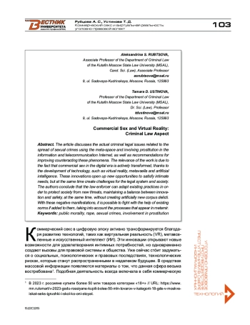 В статье рассмотрены актуальные уголовно-правовые вопросы, связанные с распространением половых преступлений с использованием метапространства и с вовлечением в занятие проституцией в информационно-телекоммуникационной сети Интернет, а также даны рекомендации по совершенствованию противодействия этим явлениям. Актуальность работы обусловлена тем, что коммерческий секс в цифровую эпоху активно трансформируется благодаря развитию технологий, таких как виртуальная реальность, метавселенные и искусственный интеллект. Эти инновации открывают новые возможности для удовлетворения интимных потребностей, но одновременно создают вызовы для правовой системы и общества. Авторы делают вывод, что правоприменитель может адаптировать существующие практики, чтобы защитить общество от новых угроз, сохраняя баланс между инновациями и безопасностью, в то же время не создавая искусственно новых составов преступления. С данными негативными проявлениями возможно бороться с помощью уже существующих норм, если внести в них дополнения с учетом процессов, появляющихся в метамире.