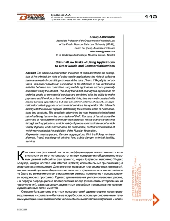 Статья является продолжением цикла работ, посвященных описанию уголовно-правовых рисков использования мобильных приложений: рисков претерпевания вреда в результате совершения преступлений и рисков причинения вреда при неочевидности противоправности. Настоящая работа содержит объяснение разницы в деятельности по выявлению рисков между деяниями, совершаемыми с использованием мобильных приложений, и деяниями, в целом совершаемыми с использованием сети Интернет. В ходе исследования установлено, что все анализируемые приложения для заказа товаров или коммерческих услуг объединены возможностью осуществления платежей и поэтому по потенциальным рискам наиболее соответствуют приложениям мобильного банкинга, однако по безопасности им уступают. В приложениях для заказа товаров или коммерческих услуг эксплуатант нередко напрямую взаимодействует с соответствующим поставщиком, определяя существенные условия заключаемых ими сделок. Такая специфика обусловливает самый главный уголовно-правовой риск претерпевания вреда — совершение хищений. К рискам причинения вреда относится приобретение через маркетплейсы ограниченных в обороте предметов. Связано это с тем, что через такие приложения коммуницируют самые разнообразные лица по поводу самых разнообразных товаров, работ и услуг, состав, содержание и исполнение которых могут противоречить законодательству РФ.