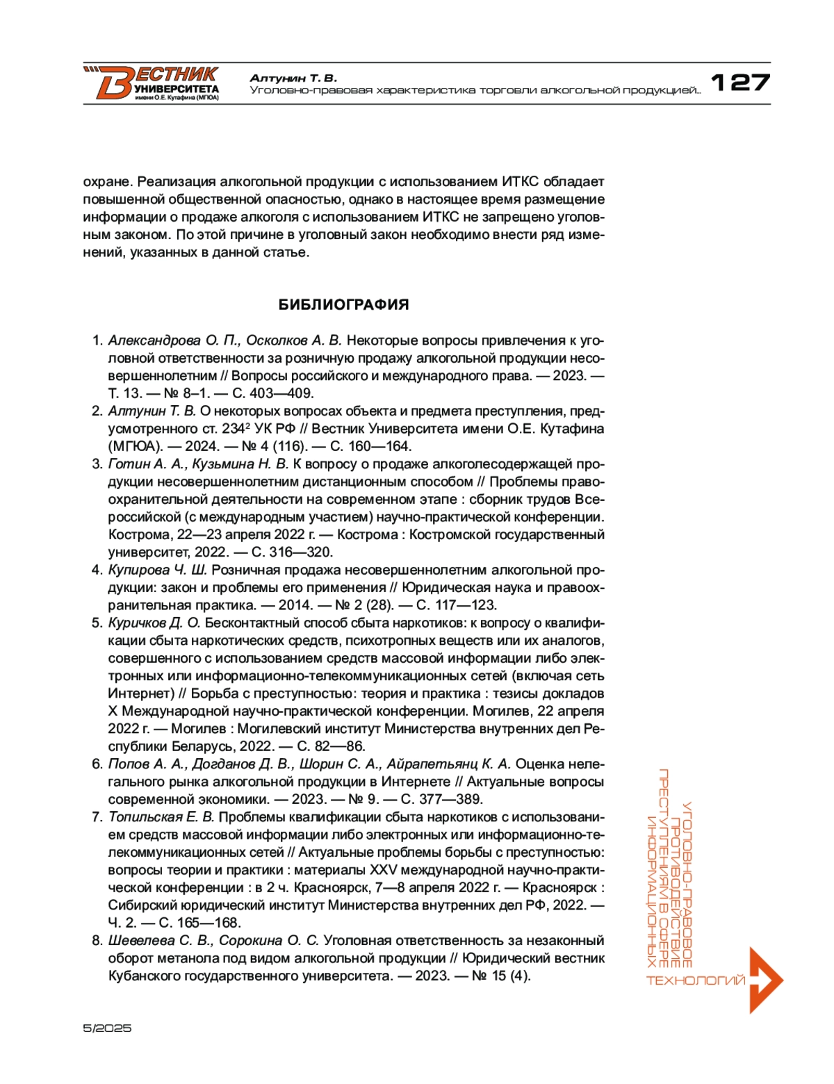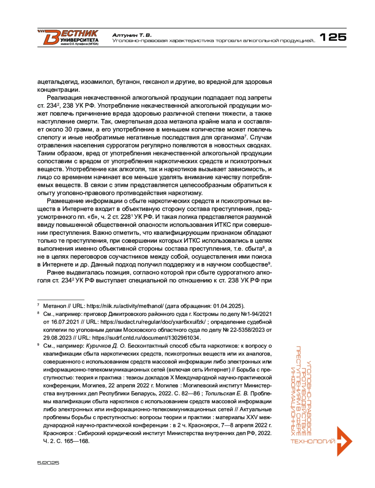 2. Алтунин Т. В. О некоторых вопросах объекта и предмета преступления, предусмотренного ст. 2342 УК РФ // Вестник Университета имени О.Е. Кутафина (МГЮА). - 2024. - № 4 (116). - С. 160-164.