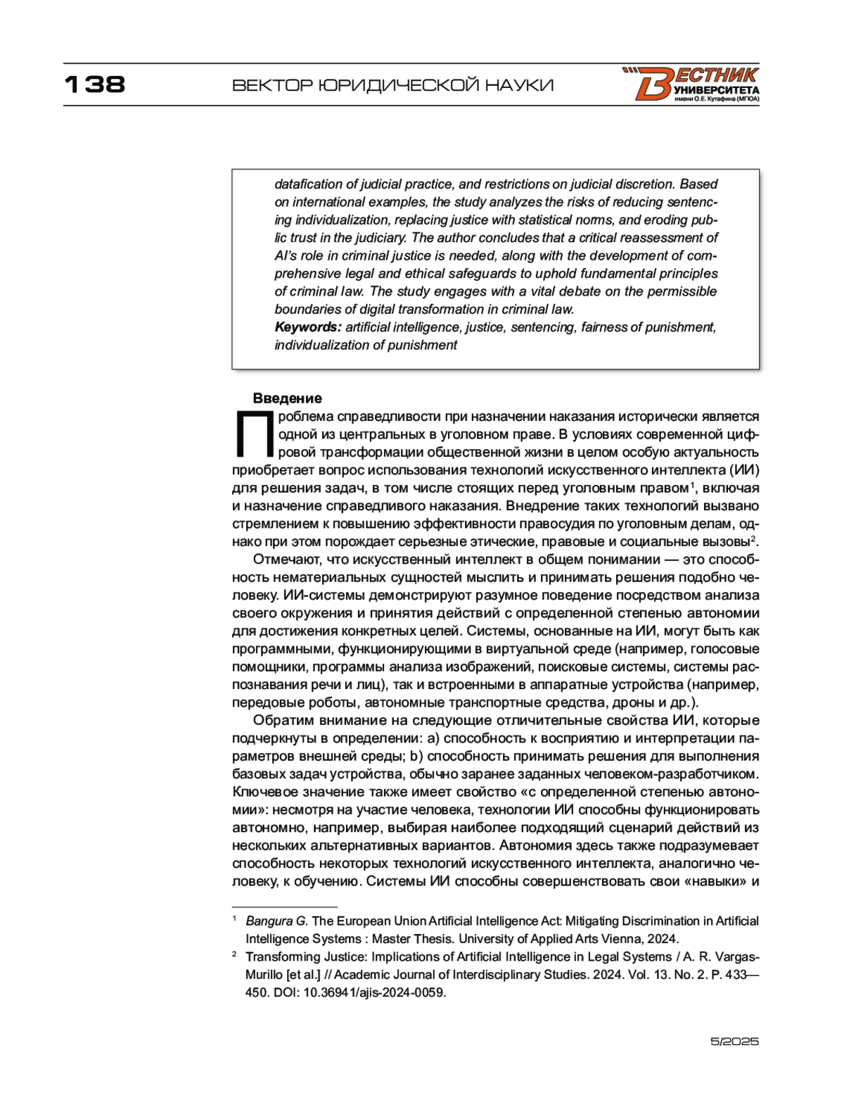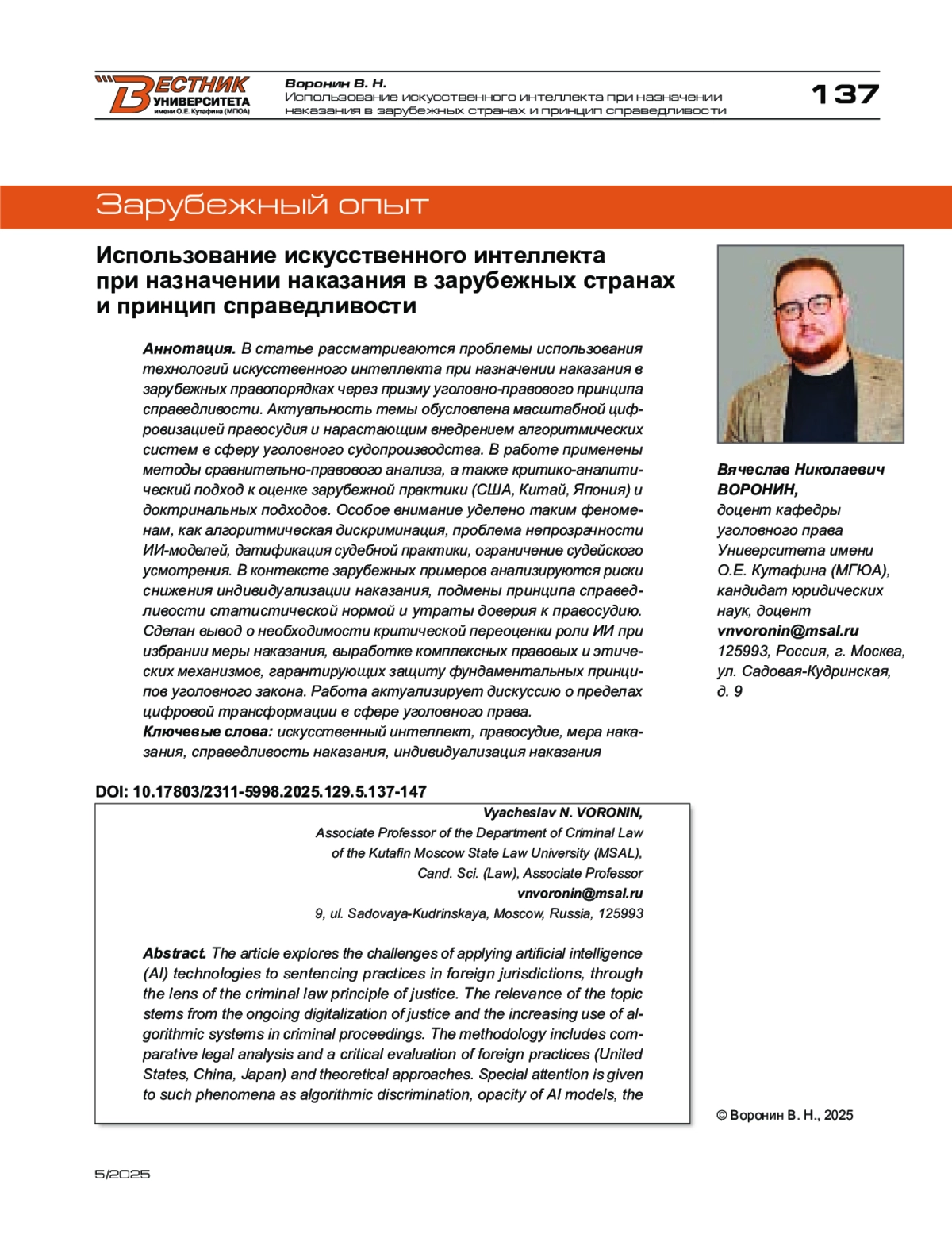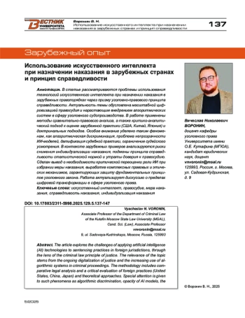 В статье рассматриваются проблемы использования технологий искусственного интеллекта при назначении наказания в зарубежных правопорядках через призму уголовно-правового принципа справедливости. Актуальность темы обусловлена масштабной цифровизацией правосудия и нарастающим внедрением алгоритмических систем в сферу уголовного судопроизводства. В работе применены методы сравнительно-правового анализа, а также критико-аналитический подход к оценке зарубежной практики (США, Китай, Япония) и доктринальных подходов. Особое внимание уделено таким феноменам, как алгоритмическая дискриминация, проблема непрозрачности ИИ-моделей, датификация судебной практики, ограничение судейского усмотрения. В контексте зарубежных примеров анализируются риски снижения индивидуализации наказания, подмены принципа справедливости статистической нормой и утраты доверия к правосудию. Сделан вывод о необходимости критической переоценки роли ИИ при избрании меры наказания, выработке комплексных правовых и этических механизмов, гарантирующих защиту фундаментальных принципов уголовного закона. Работа актуализирует дискуссию о пределах цифровой трансформации в сфере уголовного права.