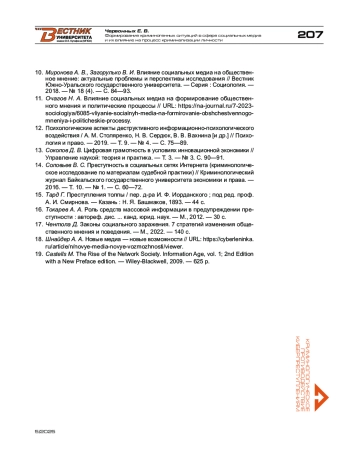 10. Миронова А. В., Загорулько В. И. Влияние социальных медиа на общественное мнение: актуальные проблемы и перспективы исследования // Вестник Южно-Уральского государственного университета. - Серия: Социология. - 2018. - № 18 (4). - С. 84-93.