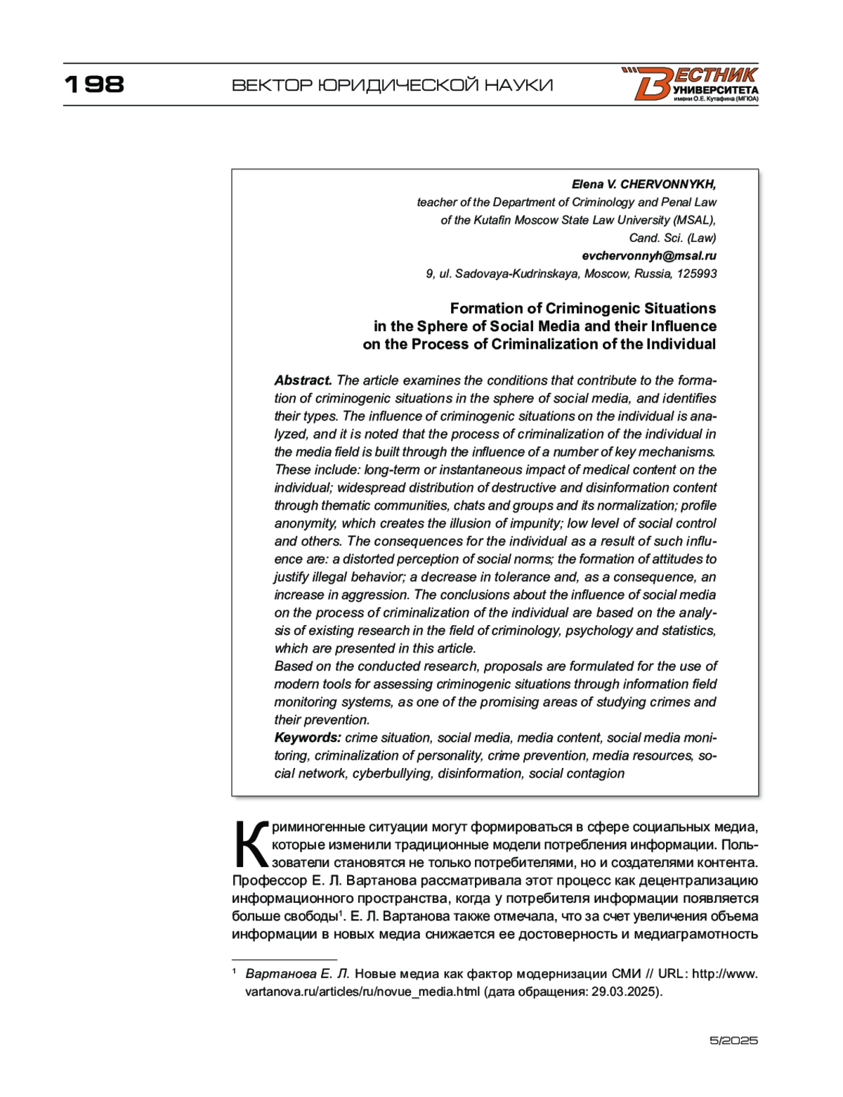 В статье рассматриваются условия, способствующие формированию криминогенных ситуаций в сфере социальных медиа, обозначаются их виды. Анализируется влияние криминогенных ситуаций на личность, отмечается, что процесс криминализации личности в медиаполе выстраивается через воздействие ряда ключевых механизмов. К ним относятся: длительное либо мгновенное воздействие медиаконтента на личность; широкое распространение деструктивного и дезинформационного контента через тематические сообщества, чаты и группы и его нормализация; анонимность профиля, которая создает иллюзию безнаказанности; низкий уровень социального контроля и др. Последствиями для личности в результате такого воздействия становятся: искаженное восприятие социальных норм; формирование установок на оправдание противоправного поведения; снижение терпимости и, как следствие, рост агрессии. Выводы о влиянии социальных медиа на процесс криминализации личности основаны на анализе существующих исследований в области криминологии, психологии и статистики, которые приводятся в данной статье. На основе проведенного исследования формулируются предложения по применению современных инструментов оценки криминогенных ситуаций через системы мониторинга информационного поля как одного из перспективных направлений изучения преступлений и их предупреждения.
