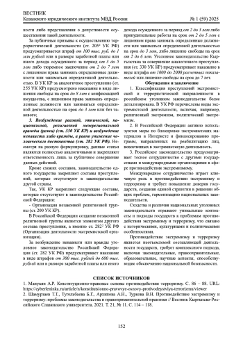 1. Манукян А.Р. Конституционно-правовые основы противодействия терроризму. С. 86 - 88. URL: https://cyberleninka.ru/article/n/konstitutsionno-pravovye-osnovy-protivodeystviya-terrorizmu/viewer.