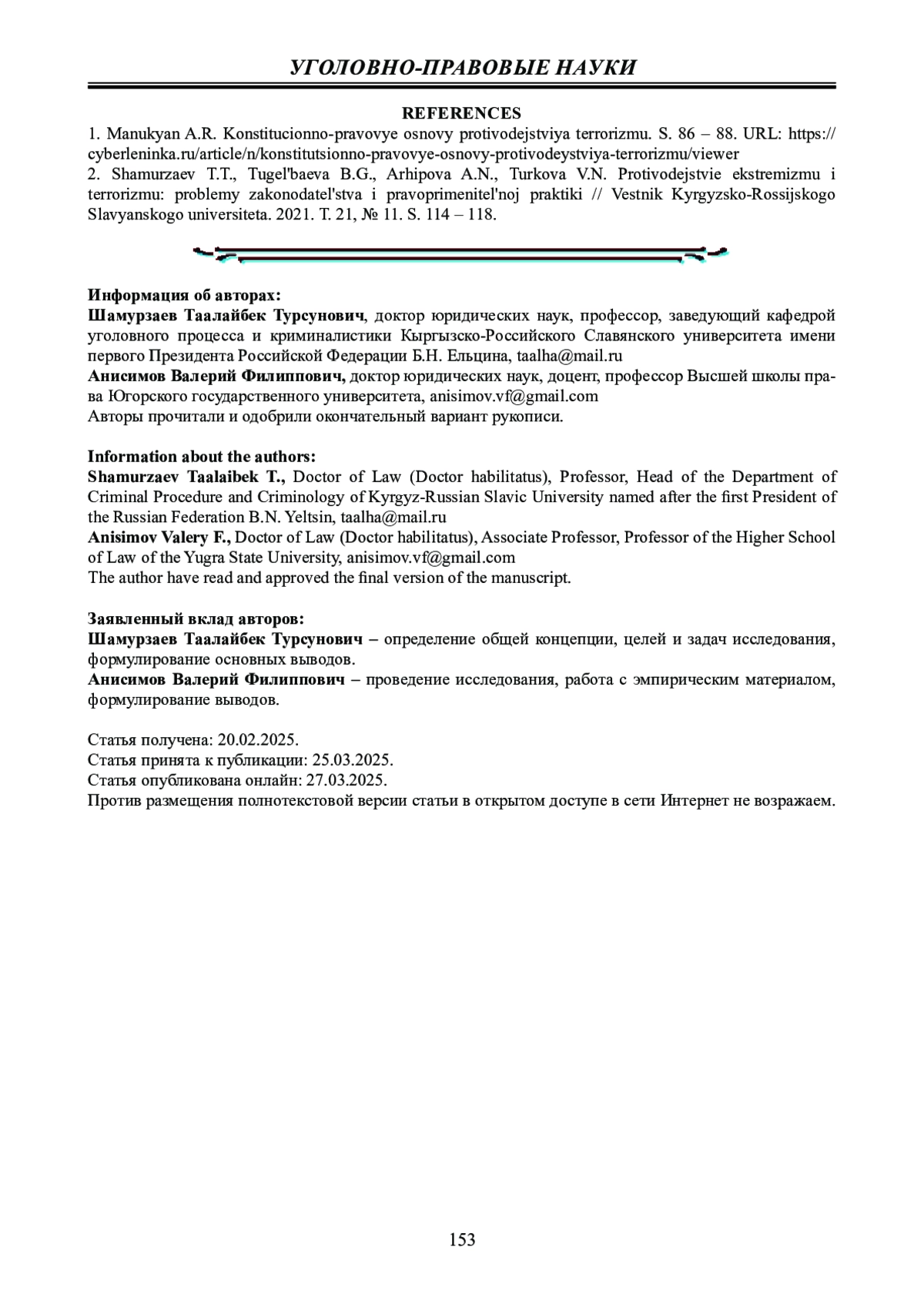2. Шамурзаев Т.Т., Тугельбаева Б.Г., Архипова А.Н., Туркова В.Н. Противодействие экстремизму и терроризму: проблемы законодательства и правоприменительной практики // Вестник Кыргызско-Российского Славянского университета. 2021. Т. 21, № 11. С. 114 - 118. EDN: TDSSGA