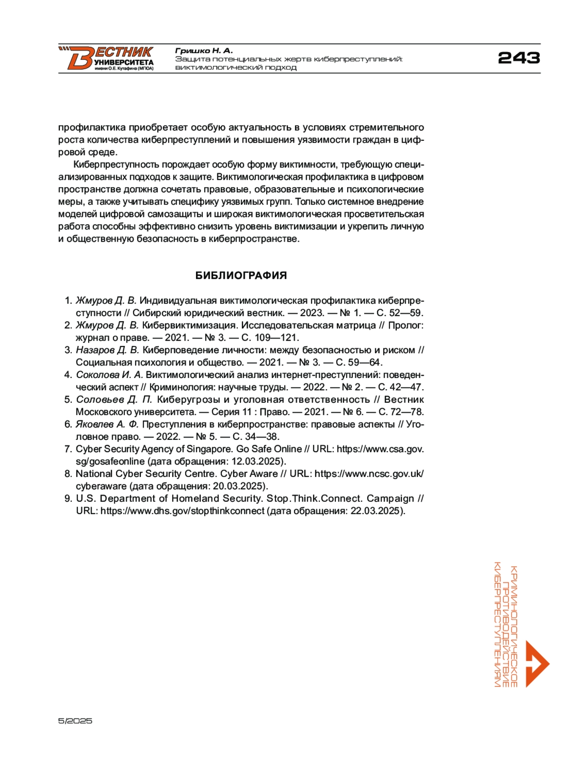 1. Жмуров Д. В. Индивидуальная виктимологическая профилактика киберпреступности // Сибирский юридический вестник. - 2023. - № 1. - С. 52-59.