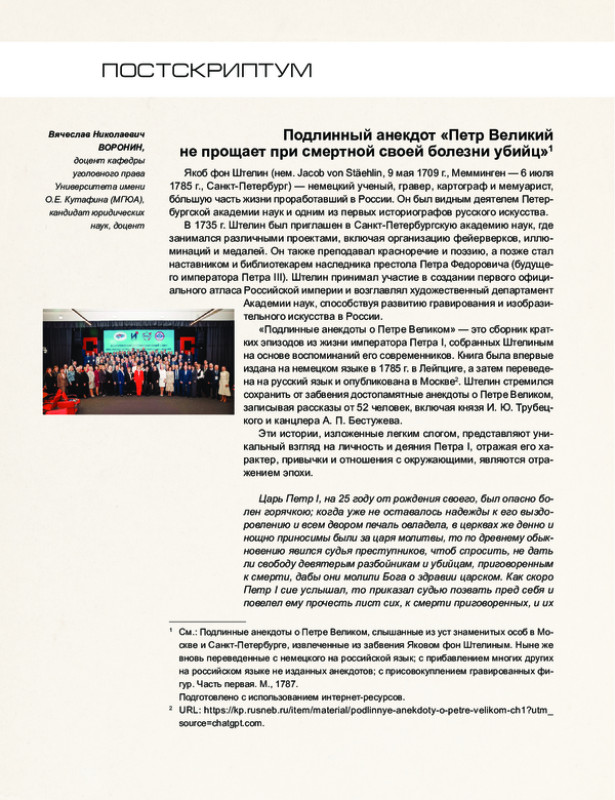 Для цитирования: Воронин В. Н. Подлинный анекдот «Петр Великий не прощает при смертной своей болезни убийц». Вестник Университета имени О. Е. Кутафина (МГЮА). 2025;(5):260-262.