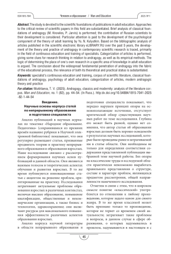 Исследование посвящено обоснованию основ научных публикаций и подходов к критическому обзору корпуса научных работ в образовании взрослых, преимущественно в области андрагогики. Выполнен краткий анализ классических оснований андрагогики (М. Ноулз, П. Джарвис); рассмотрен вклад учёных нашей страны в её развитие. Особое внимание уделено разработке Ю. Н. Кулюткиным психологического компонента теории обучения взрослых. На основе библиографического анализа статей, опубликованных в научной электронной библиотеке eLIBRARY. RU в течение последних 5 лет, прослеживается развитие теории и практики андрагогики в современных научных исследованиях, прежде всего в области непрерывного образования и подготовки специалистов. Выполнена категоризация статей, дающая некоторые подсказки для исследовательского мышления в отношении андрагогики, а также её эмпирических методов. Аргументируется логика определения места собственного исследования в конкретной области знаний в образовании взрослых. Обосновывается вывод о повсеместном фундаментальном проникновении андрагогики в ткань образовательного процесса в настоящее время, актуальности как её теоретического, так и практического статуса.