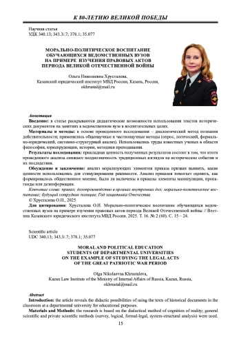 Введение: в статье раскрываются дидактические возможности использования текстов исторических документов на занятиях в ведомственном вузе в воспитательных целях. Материалы и методы: в основе проведенного исследования - диалектический метод познания действительности; применялись общенаучные и частнонаучные методы (опрос, логический, формально-юридический, системно-структурный анализ). Использовались труды известных ученых в области философии, юриспруденции, истории, методики преподавания. Результаты исследования: прикладная ценность полученных результатов состоит в том, что итоги проведенного анализа снижают неоднозначность традиционных взглядов на исторические события и их последствия. Обсуждение и заключение: анализ морализующих элементов приказа призван выявить, какие ценности использовались для стимулирования решимости. Анализ приказов помогает оценить, как формировалось общественное мнение, были ли включены в приказы элементы манипуляции, пропаганды или дезинформации.