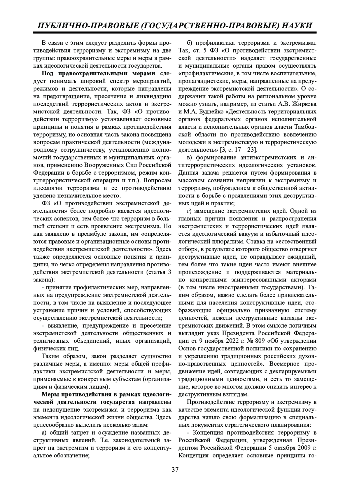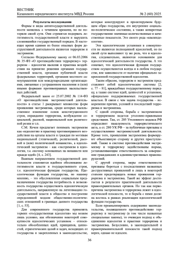 Обсуждение и заключение: автор предлагает разделить формы противодействия терроризму и экстремизму на две группы: правоохранительные меры и меры в рамках идеологической деятельности государства. Под правоохранительными мерами следует понимать широкий спектр мероприятий, режимов и деятельности, которые направлены на предотвращение, пресечение и ликвидацию последствий террористических актов и экстремистской деятельности. Меры противодействия в рамках идеологической деятельности государства направлены на недопущение экстремизма и терроризма как элемента идеологической жизни общества. Таким образом, противодействие терроризму и экстремизму проявляется как в практическом аспекте (согласованной деятельности правоохранительных органов, органов власти и силовых ведомств), так и идеологическом (составляющим отдельное направление идеологической функции государства).