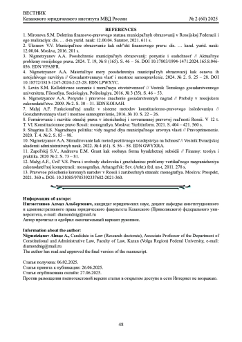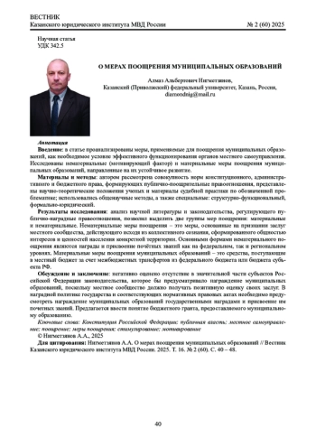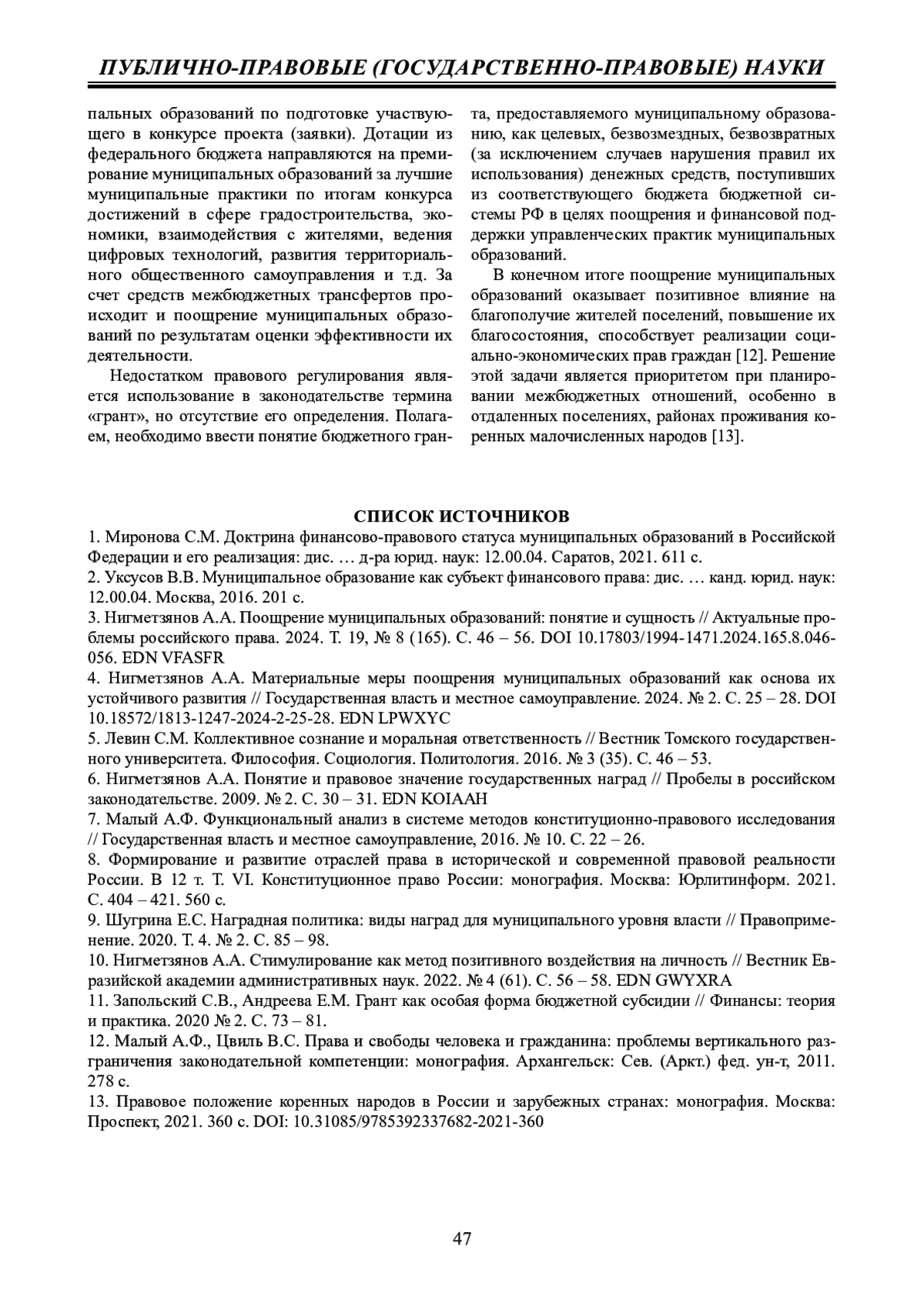 3. Нигметзянов А.А. Поощрение муниципальных образований: понятие и сущность // Актуальные проблемы российского права. 2024. Т. 19, № 8 (165). С. 46 - 56. DOI: 10.17803/1994-1471.2024.165.8.046-056 EDN: VFASFR