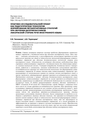 Статья посвящена вопросам изучения проблемы формирования метакогнитивных стратегий у десятиклассников при обучении иностранному языку. Цель статьи - показать возможность и целесообразность использования практико-исследовательского проекта как одной из педагогических технологий формирования метакогнитивных стратегий при обучении десятиклассников лексической стороне речи иностранного языка. Актуальность исследования обусловлена необходимостью формирования метакогнитивных стратегий у десятиклассников для оптимизации процесса усвоения иноязычной лексики. Учитывая потребность десятиклассников к планированию, рефлексии и самоанализу, показана необходимость использования практико-исследовательского проекта как педагогической технологии для формирования метакогнитивных стратегий. В статье описаны виды метакогнитивных стратегий, проанализировано их положительное влияние на усвоение лексики иностранного языка, а также предложен адаптированный вариант практико-исследовательского проекта. Предлагается включение в процесс обучения десятиклассников иностранному языку формирование метакогнитивных стратегий на основе практико-исследовательского проекта, направленного на рефлексию собственной деятельности по усвоению лексики английского языка. В статье проанализировано опытное обучение, проведенное в МБОУ «Гимназия № 64 имени В. А. Котельникова» города Липецка с учащимися десятого класса на основе практико-исследовательского проекта «Как применение метакогнитивных стратегий повлияет на мое усвоение лексики английского языка?»: представлена анкета, проанализированы результаты анкетирования, предложены 5 вариантов кейсов для проведения практико-исследовательского проекта, описаны организация и результаты опытного обучения. Анализ литературы по проблеме исследования и проведенное опытное обучение показали, что практико-исследовательский проект может являться одной из педагогических технологий формирования метакогнитивных стратегий при обучении иностранному языку, так как обучающиеся не только получают знания о метакогнитивных стратегиях, но и могут проверить их эффективность на практике в процессе изучения иностранного языка. Практические материалы статьи представлены на русском языке, так как они носят универсальный характер и могут быть использованы при обучении любому иностранному языку.
