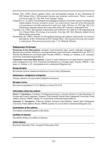 12. Zimmerman B.J. Theories of self-regulated learning and academic achievement: An overview and analysis // Self-regulated learning and academic achievement: Theoretical perspectives. Ed. by B.J. Zimmerman, D.H. Schunk. Mahwah: Eribaum, 2001. Pp. 1-37.
