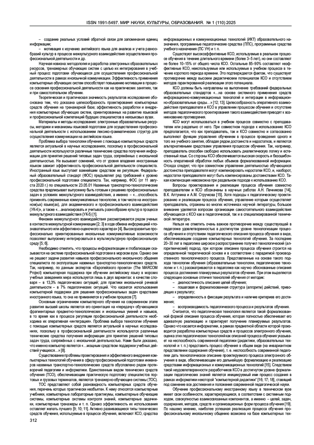 Целью научного исследования является проектирование компьютерных технологий для развития профессиональных иноязычных возможностей студента. Актуальность этой проблемы обусловлена противоречиями в сфере проектирования и внедрения компьютерных технологий в профессиональную подготовку специалистов портовых и грузовых терминалов. Основные противоречия ведут к решению проблемы обоснования и разработки методологии проектирования компьютерных технологий подготовки как взаимоувязанной совокупности концептуальных положений и практических методов проектирования электронного обучения. В данном научном исследовании сформулированы основные противоречия: наличие информационных обучающих программ и отсутствие методов гарантированной реализации этого потенциала; целесообразность оперативного взаимодействия преподавателя и компьютерных средств обучения (КСО) и отсутствие алгоритмов такого взаимодействия; широкая компьютеризация обучения и слабая представленность педагогических аспектов ее проектирования.