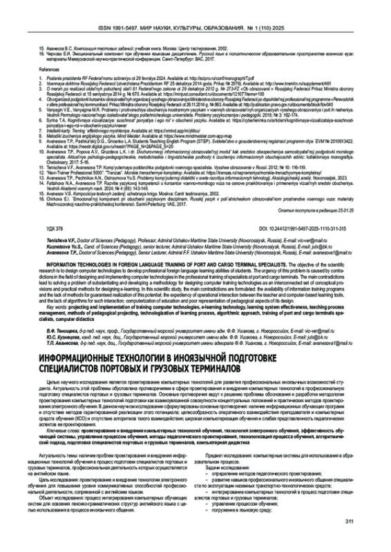 3. Тенищева В.Ф., Кузнецова Ю.С., Цыганко Е.Н. Совершенствование профессиональной иноязычной подготовки будущих инженеров в сфере эксплуатации оборудования портов и терминалов. Вестник государственного морского университета имени адмирала Ф.Ф. Ушакова. 2021 № 2 (35): 89. EDN: OHPBZE