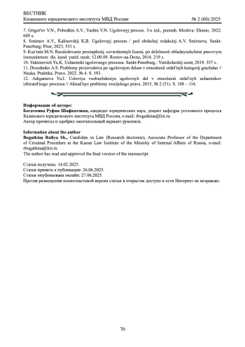 6. Якубина Ю.П. Особенности производства по уголовным делам в отношении отдельных категорий лиц // Орловский юридический институт МВД России. 2023. № 24. С. 237 - 242.