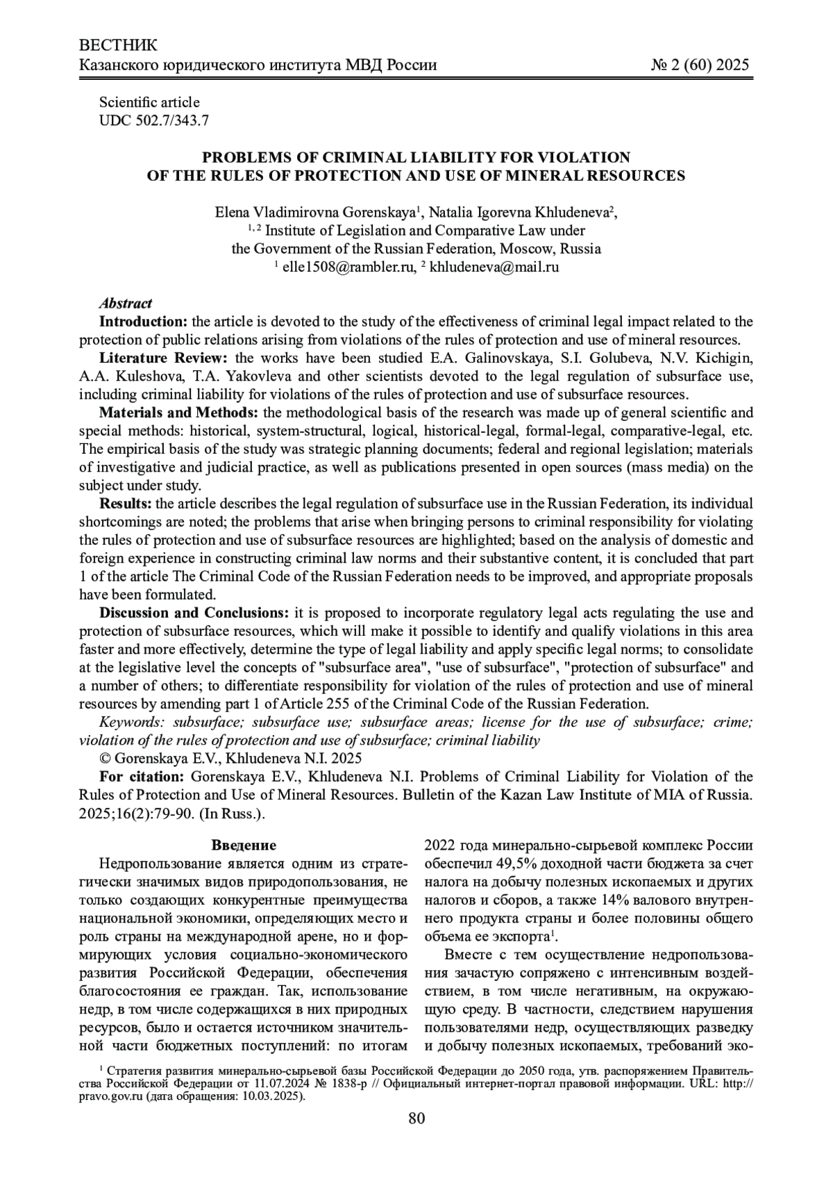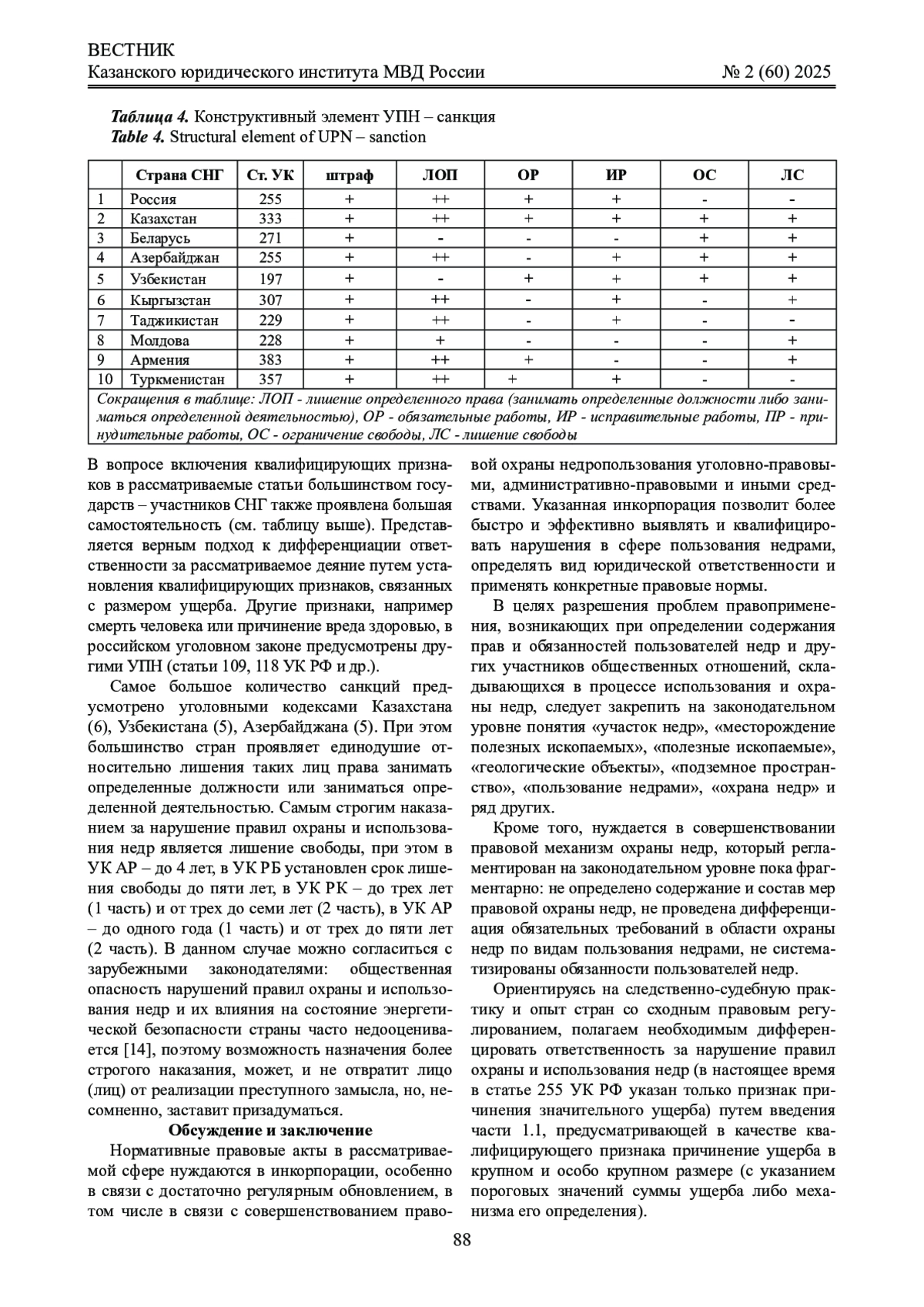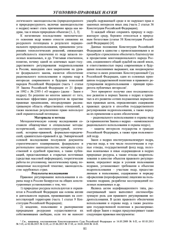 бсуждение и заключение: предлагается инкорпорировать нормативные правовые акты, регулирующие вопросы использования и охраны недр, что позволит более быстро и эффективно выявлять и квалифицировать нарушения в указанной сфере, определять вид юридической ответственности и применять конкретные правовые нормы; закрепить на законодательном уровне понятия «участок недр», «пользование недрами», «охрана недр» и ряд других; дифференцировать ответственность за нарушение правил охраны и использования недр путем внесения изменений в часть 1 статьи 255 УК РФ.