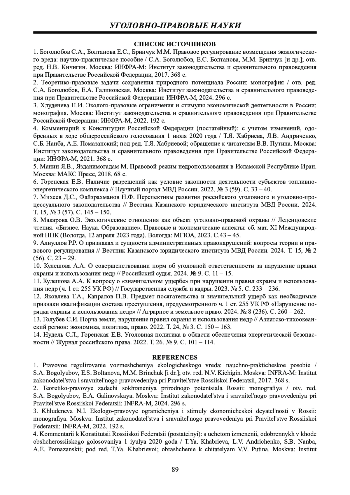 8. Макарова О.В. Экологические отношения как объект уголовно-правовой охраны // Леденцовские чтения. “Бизнес. Наука. Образование”. Правовые и экономические аспекты: сб. мат. XI Международной НПК (Вологда, 12 апреля 2023 года). Вологда: МГЮА, 2023. С.43 - 45. EDN: TBHHZW