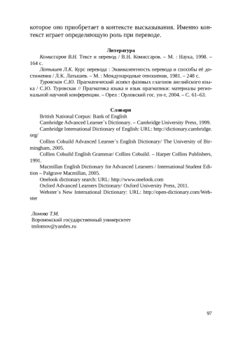 3. Туровская С.Ю. Прагматический аспект фазовых глаголов английского языка / С.Ю. Туровская // Прагматика языка и язык прагматики: материалы региональной научной конференции. - Орел: Орловский гос. ун-т, 2004. - С. 61-63.