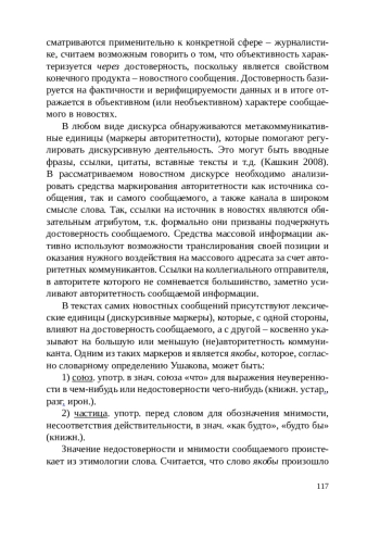 Данная статья посвящена одному из способов актуализации категории авторитетности, присутствующей в любом виде дискурса. Данная категория является основополагающей в новостном дискурсе, где коммуникация между условным отправителем и получателем происходит с учетом статусно-ролевых отношений, налагаемых данным типом институционального общения. В новостном дискурсе присутствуют маркеры, влияющие на авторитетность, одним из которых является дискурсивный маркер якобы. Отмечается его способность указывать как на степень достоверности информации, так и на авторитетность новостного сообщения. В анализе влияния дискурсивного маркера якобы на авторитетность новостей учитывается многоуровневый характер категории авторитетности.