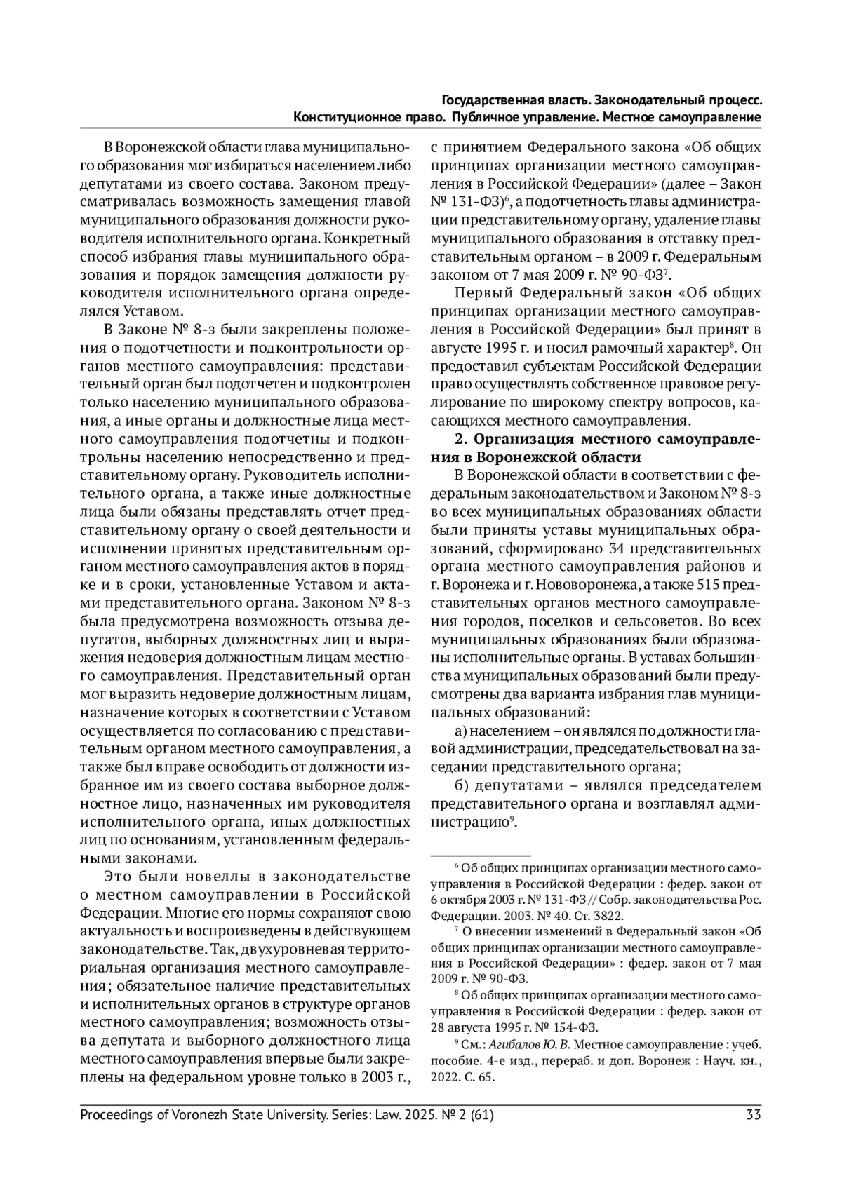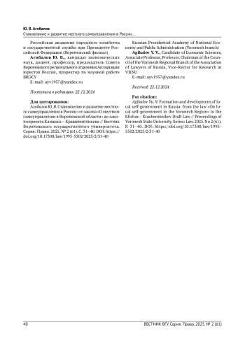 2. Агибалов Ю. В. Становление и развитие института главы муниципального образования в России: теоретические и правовые основы // Вестник Воронеж. гос. ун-та. Серия: Право. 2022. № 4. С. 353-365.