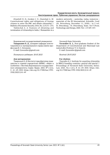 6. Эриашвили Н. Д., Гордеев И. В., Осавелюк А. М. Конституционные права и обязанности иностранных граждан на въезд в КНР и получения гражданства // Вестник экономической безопасности. 2016. № 2. С. 271-274.
