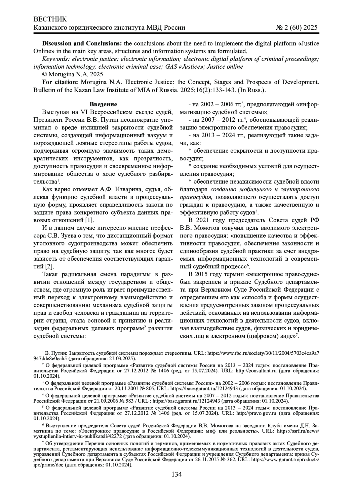 Обсуждение и заключение: сформулированы выводы о необходимости внедрения цифровой платформы «Правосудие онлайн» в основные ключевые области, структуры и информационные системы.
