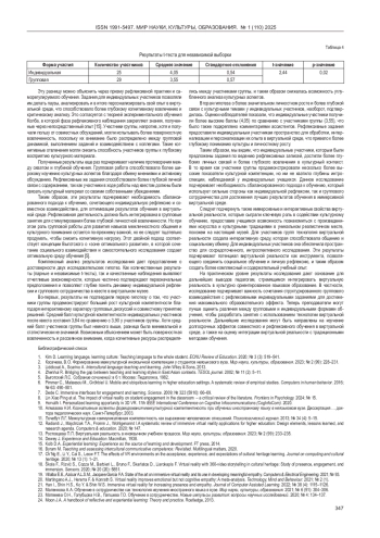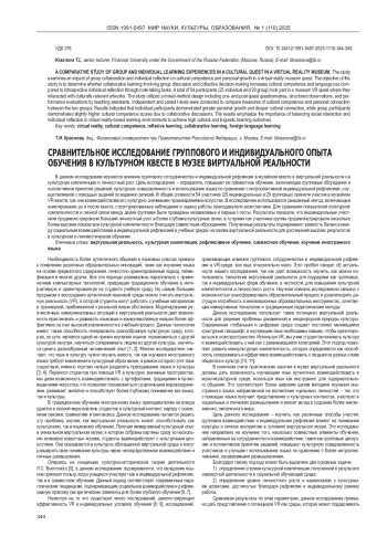 В данном исследовании изучается влияние группового сотрудничества и индивидуальной рефлексии в музейном квесте в виртуальной реальности на культурную компетенцию и личностный рост. Цель исследования - определить, повышает ли совместное обучение, включающее групповые обсуждения и коллективное принятие решений, культурную осведомленность и использование языка по сравнению с интроспективной индивидуальной рефлексией, осуществляемой с помощью заданий по ведению записей. В общей сложности 54 участника (25 индивидуальных и 29 групповых) приняли участие в музейном VR-квесте, где они взаимодействовали с культурно значимыми произведениями искусства. В исследовании использовался смешанный метод, включающий анкетирование до и после квеста, структурированные наблюдения и оценку работы преподавателя ассистентами. Для сравнения показателей культурной компетентности и личной связи между двумя группами были проведены независимые и парные t-тесты. Результаты показали, что индивидуальные участники продемонстрировали больший личностный рост и более глубокие культурные связи, в то время как участники группы продемонстрировали несколько более высокие показатели культурной компетентности благодаря совместным обсуждениям. Полученные результаты подчеркивают важность баланса между социальным взаимодействием и индивидуальной рефлексией в учебных средах на основе виртуальной реальности для достижения высоких результатов в культурном и лингвистическом обучении.