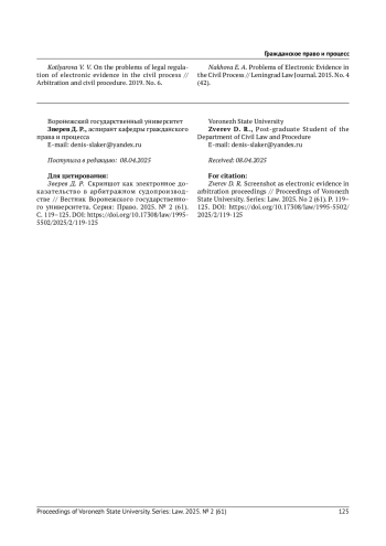 Рассматриваются определение электронного доказательства и его место в гражданском процессе, анализируются различные подходы к оценке скриншотов в качестве доказательств. На основе изучения судебной практики и научных работ выявлены пробелы в правовом регулировании, препятствующие эффективному использованию скриншотов в судопроизводстве. Обоснована целесообразность использования скриншотов как электронных доказательств в арбитражном процессе. Выявлена необходимость в законодательном урегулировании вопроса о скриншотах, используемых в качестве электронных доказательств в арбитражных судах, поскольку их текущий статус и доказательственная сила недостаточно определены.