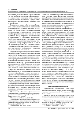8. Западнова Ю. А. Неисполнение обязанностей по воспитанию несовершеннолетнего: проблемы установления признаков специального субъекта преступления // Вестник экономической безопасности. 2016. № 6. С. 60-65.