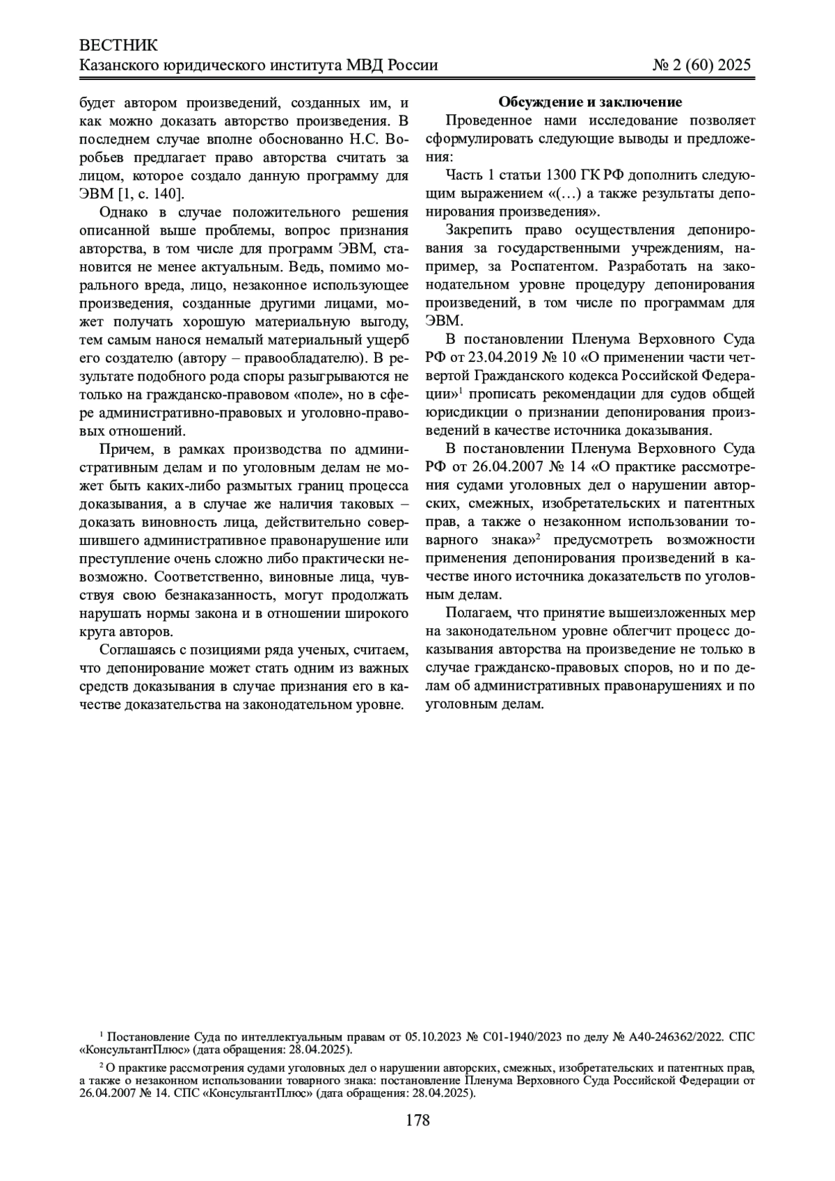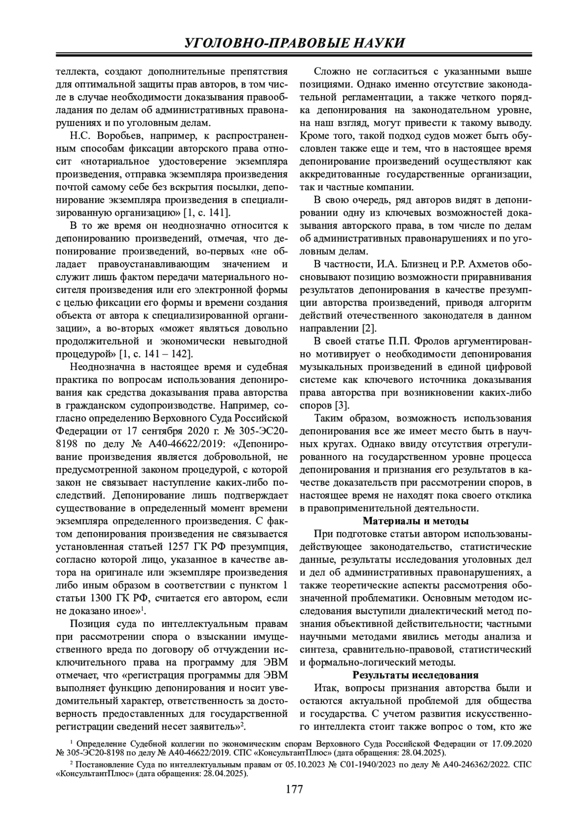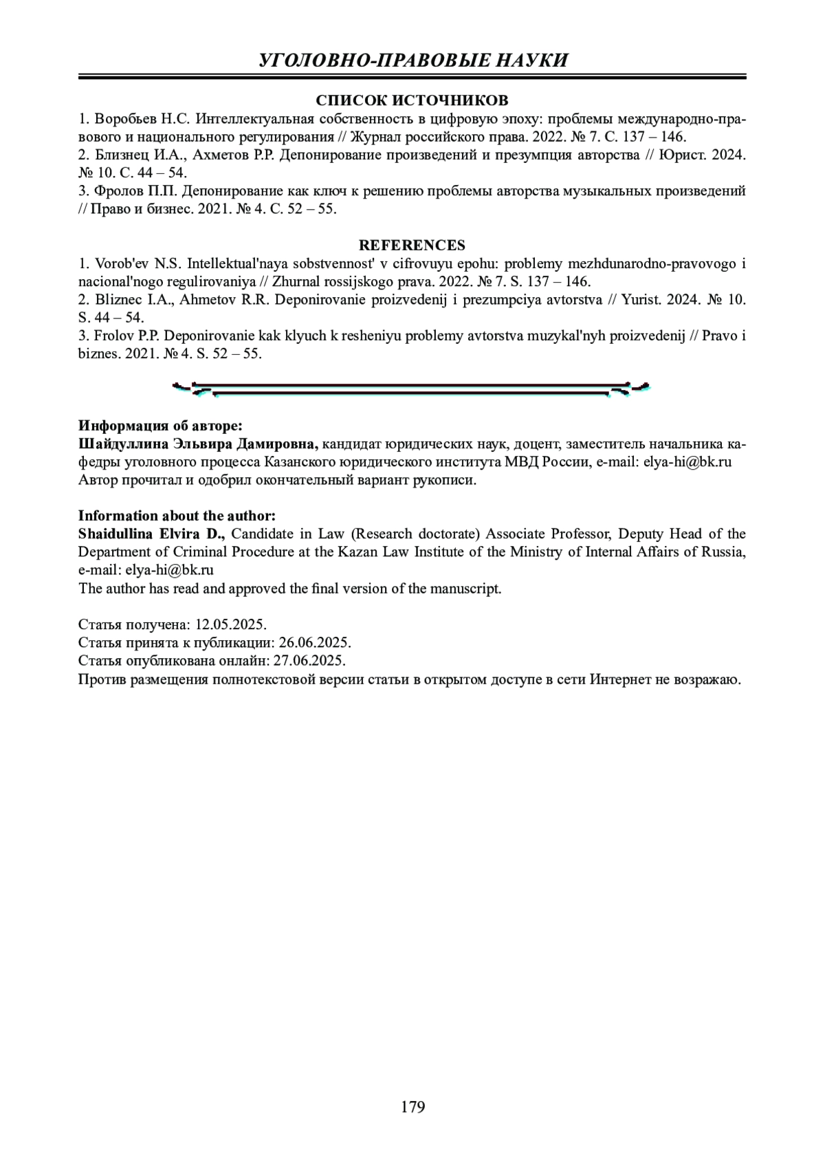 2. Близнец И.А., Ахметов Р.Р. Депонирование произведений и презумпция авторства // Юрист. 2024. № 10. С. 44 - 54. EDN: UZOQFS