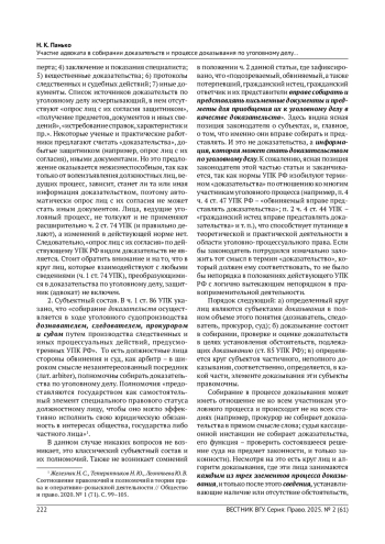 5. Ляхова А. И., Винникова Д. С. Полномочия адвоката-защитника по участию в собирании доказательств // Вызовы современности и стратегии развития общества в условиях новой реальности: материалы XVI Междунар. науч.-практ. конф. М., 2023.-С. 73-79. EDN: XKORWA